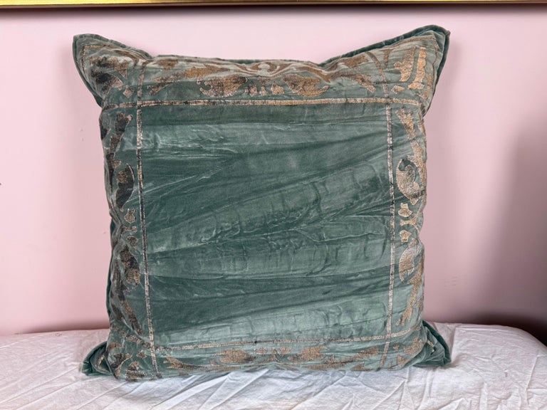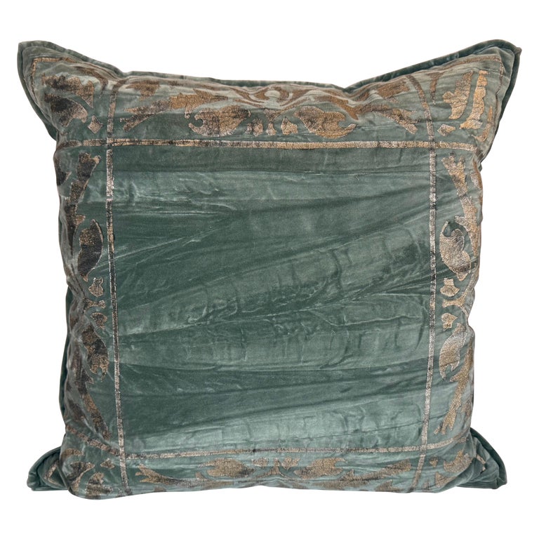 This sumptuous pillow by Nomi Textiles is made from soft, blue-green velvet and features a refined hand-stenciled design that brings an air of timeless elegance. The decorative stencil work is rendered in a muted metallic or antique gold tone, forming a beautifully framed border of scrolling botanical and vine motifs that draw the eye inward to the plush velvet center. The pillow’s rich velvet surface has a gently ruched texture, adding depth and softness, while the stenciled frame evokes a vintage or classical textile panel—reminiscent of Renaissance or Ottoman decorative arts. The craftsmanship highlights Nomi Textiles’ signature style: a mix of artisanal detail, historic reference, and luxurious materiality. Down insert.