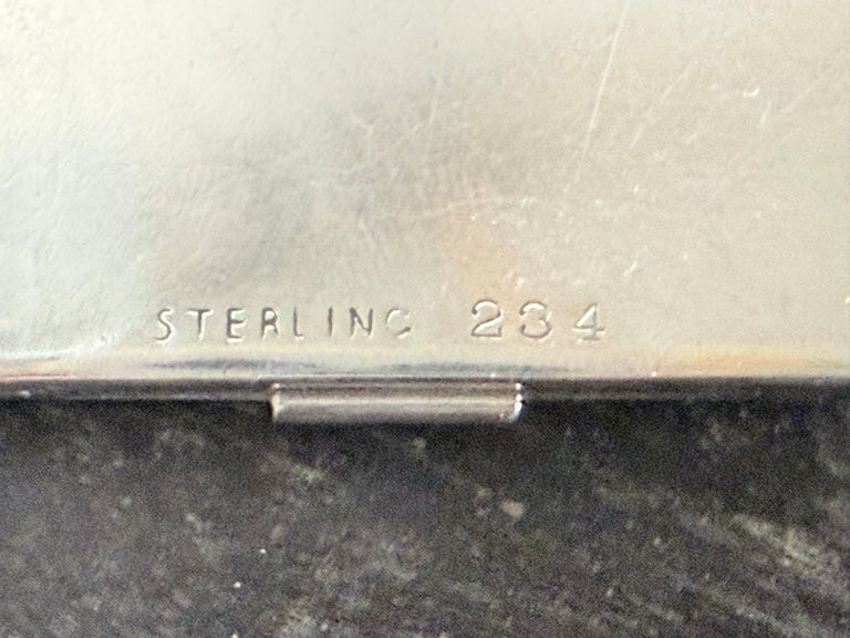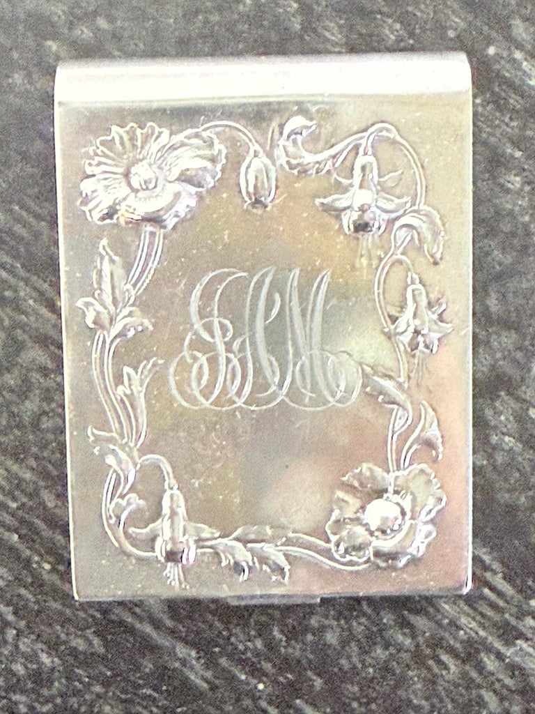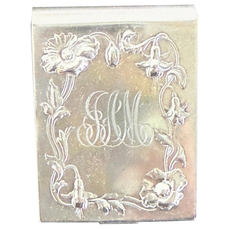 This antique sterling silver match safe, also known as a vesta case, is a finely crafted example of Art Nouveau design dating to the late 19th or early 20th century. The front is beautifully adorned with high-relief floral motifs—likely poppies or fuchsias—framing an elegant script monogram. The flowers are rendered in the fluid, organic lines characteristic of the Art Nouveau style, lending the piece a delicate, romantic charm. Inside, the case opens on a smooth hinge to reveal a compartment for storing strike-anywhere matches, which it was originally designed to protect from moisture and damage. The case is stamped “Sterling 234” and closes securely with a tight, flush fit. A graceful and functional piece of personal history, it would make a striking addition to any collection of antique silver or decorative accessories.