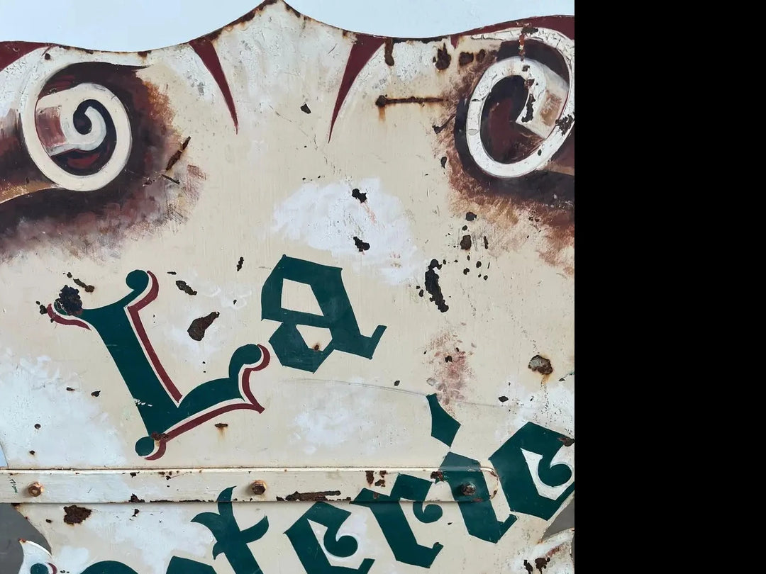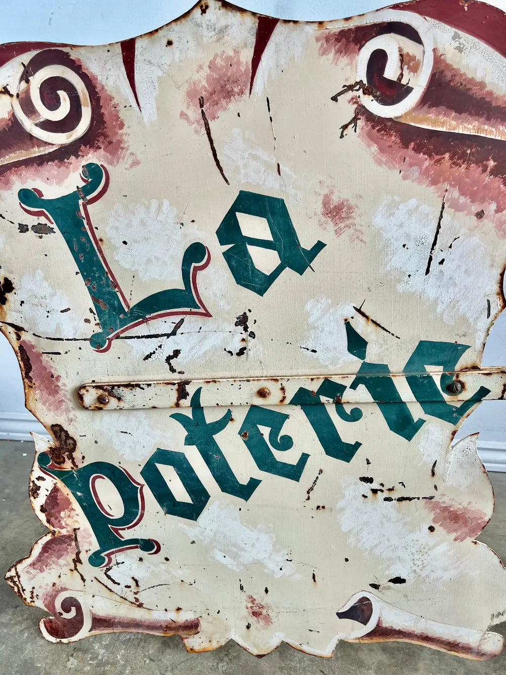 Great 1930's European French hand painted Pottery Store Sign. The sign is painted on both sides. Some paint is missing and the sign had wear from years of use.