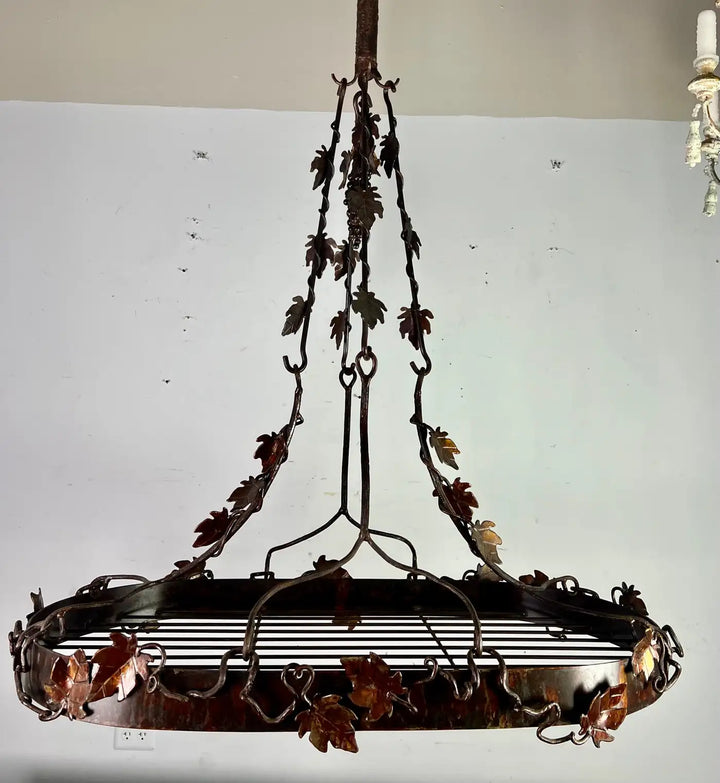 20th century hand forged wrought iron pot rack with decorative vines and leaves throughout. It was hand made out of iron and finished with a hint of copper color to give a radiant glow and coordinate with your copper pots.