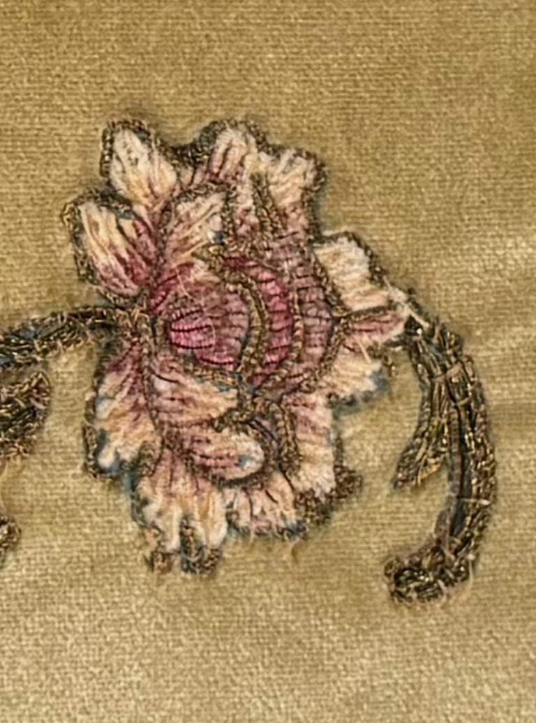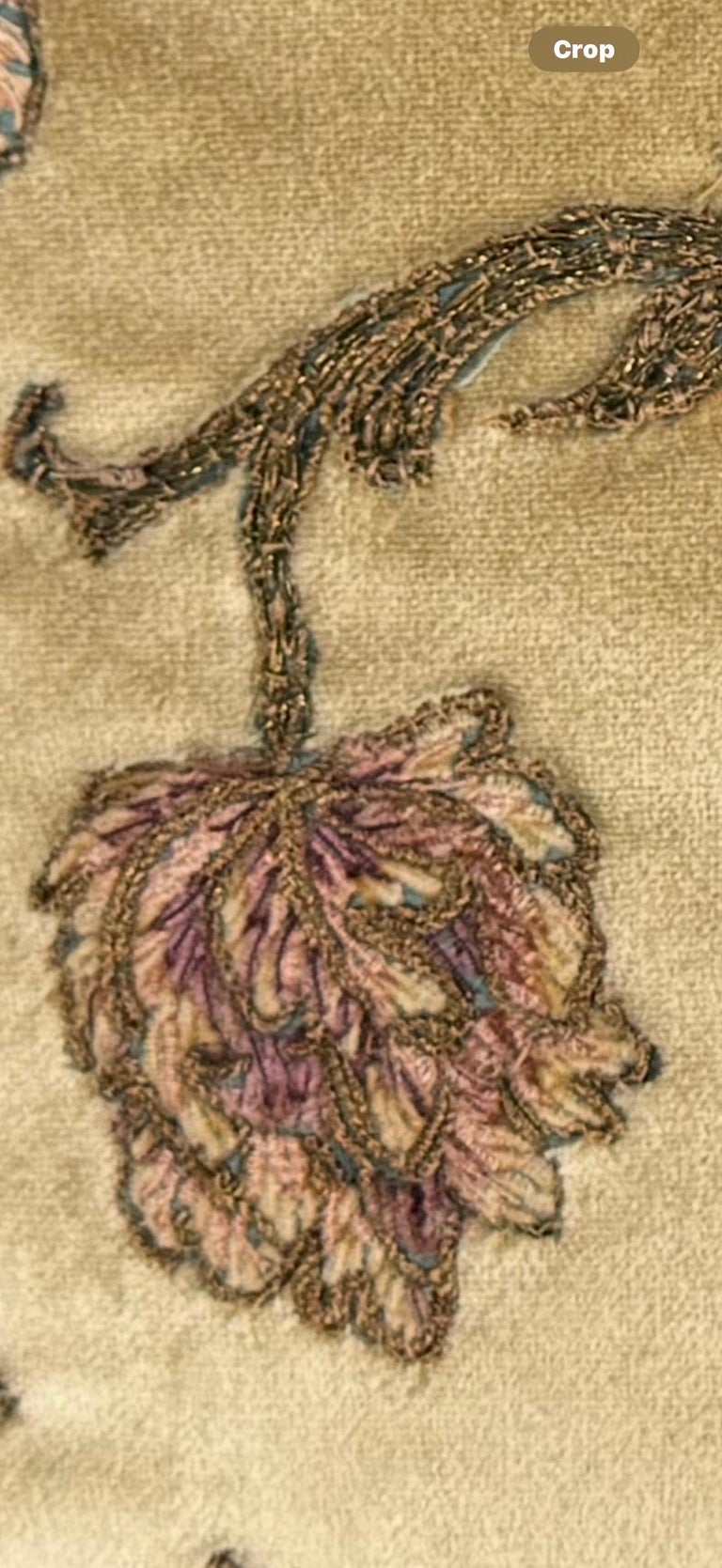 The antique embroidery displays the hallmarks of true 19th century French textile work: softly oxidized metallic threads, nuanced tonal variation, and delicate chenille highlights that create depth, movement, and a beautifully timeworn elegance. These historic elements are intentionally contrasted with the clean structure and precision of contemporary construction, resulting in pillows that feel both old-world and fresh.
