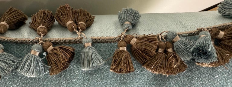 Each pillow is finished with an elegant French passementerie pom-pom trim, custom-made in complementary shades of blue and warm brown, lending texture, movement, and a distinctly European sensibility. The backs are completed in a coordinating blue linen, offering a clean, tailored finish. Constructed with hidden zipper closures and luxurious down-filled inserts, these pillows are designed for both comfort and longevity.