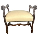 19th C. Italian Baroque style bench with a wooden frame and upholstered seat.  The frame is finely carved with decorative acanthus leaf details, especially on the legs and the arms.  The arms are gracefully scrolled, adding a touch of sophistication, while the legs are ornately carved and connected by a curved stretcher for added stability.  The seat is upholstered in a faux leather and is bordered with a row of nailhead trim, adding a classic touch.  This bench has a refined look that combines comfort with a traditional, antique charm, suitable for a hallway, living room, or bedroom.