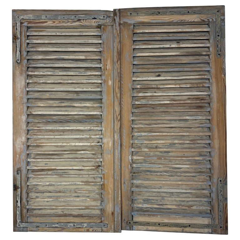 These 19th-century antique French shutters showcase a classic provincial style with a rich, weathered patina that speaks to their age and authenticity. Crafted from solid wood, the shutters feature fixed louvers, allowing ventilation while maintaining privacy—an essential design element in traditional European architecture. The aged finish reveals layers of faded paint, worn down to expose the natural grain and knots of the wood, with hints of grey, beige, and light blue undertones. The distressing is natural and consistent with timeworn use, including oxidation around the metal hinge areas and some minor cracks in the wood. The hand-forged iron hardware remnants still present (such as hinge plates and screw holes) enhance their rustic charm and historical character. Overall, these shutters offer a beautifully preserved piece of 19th-century French craftsmanship—ideal for decorative wall installations or repurposed as architectural accents in vintage or farmhouse-style interiors.