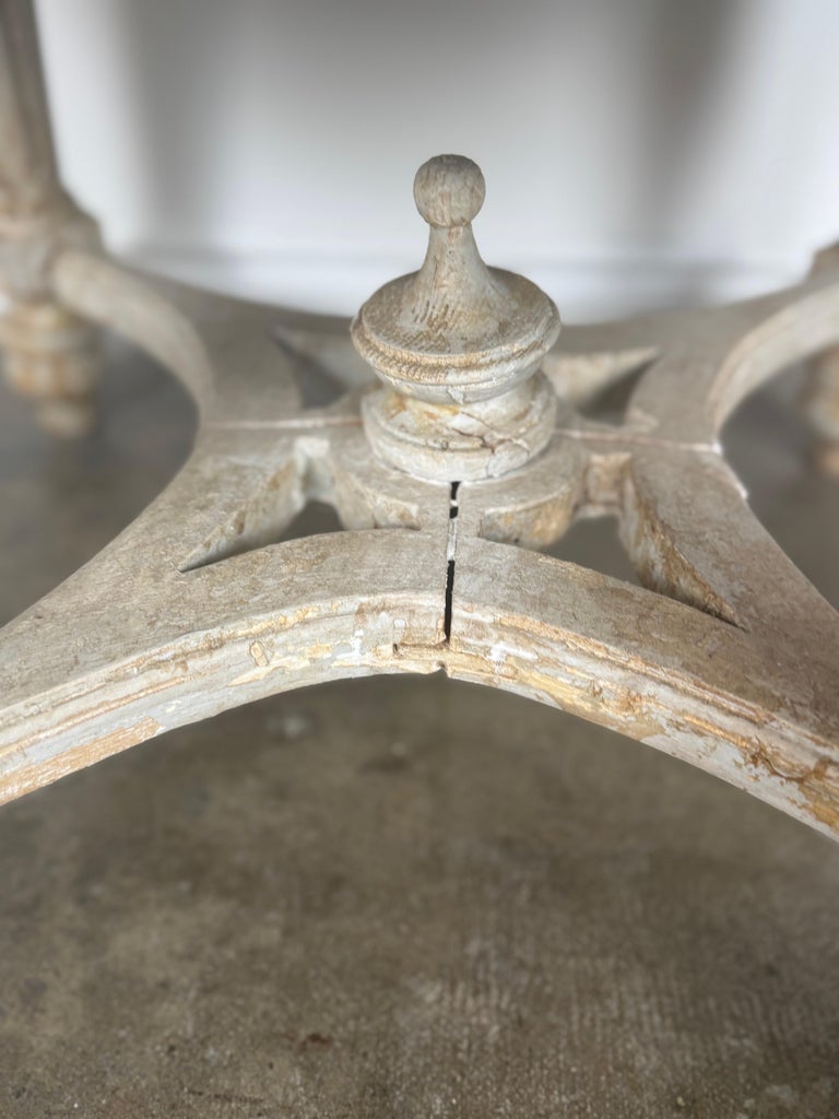 Raised on turned and tapered legs joined by an arched X-form stretcher with a central turned finial, the piece is both sculptural and well balanced. Classic in form and proportion, this ottoman works beautifully as accent seating, a vanity stool, or a decorative footstool, bringing refined French architectural detail to any interior.