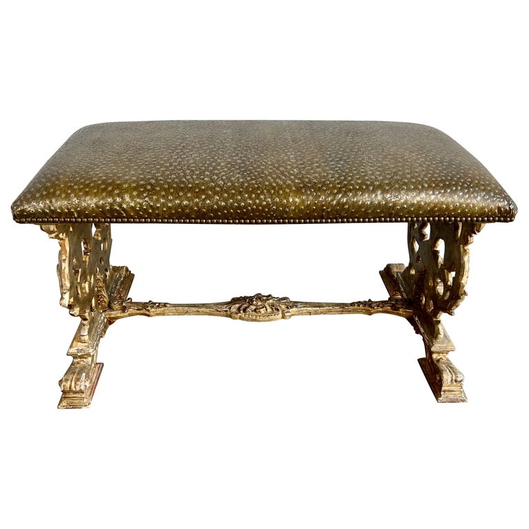 Italian Carved Giltwood Bench W/ Embossed Leather