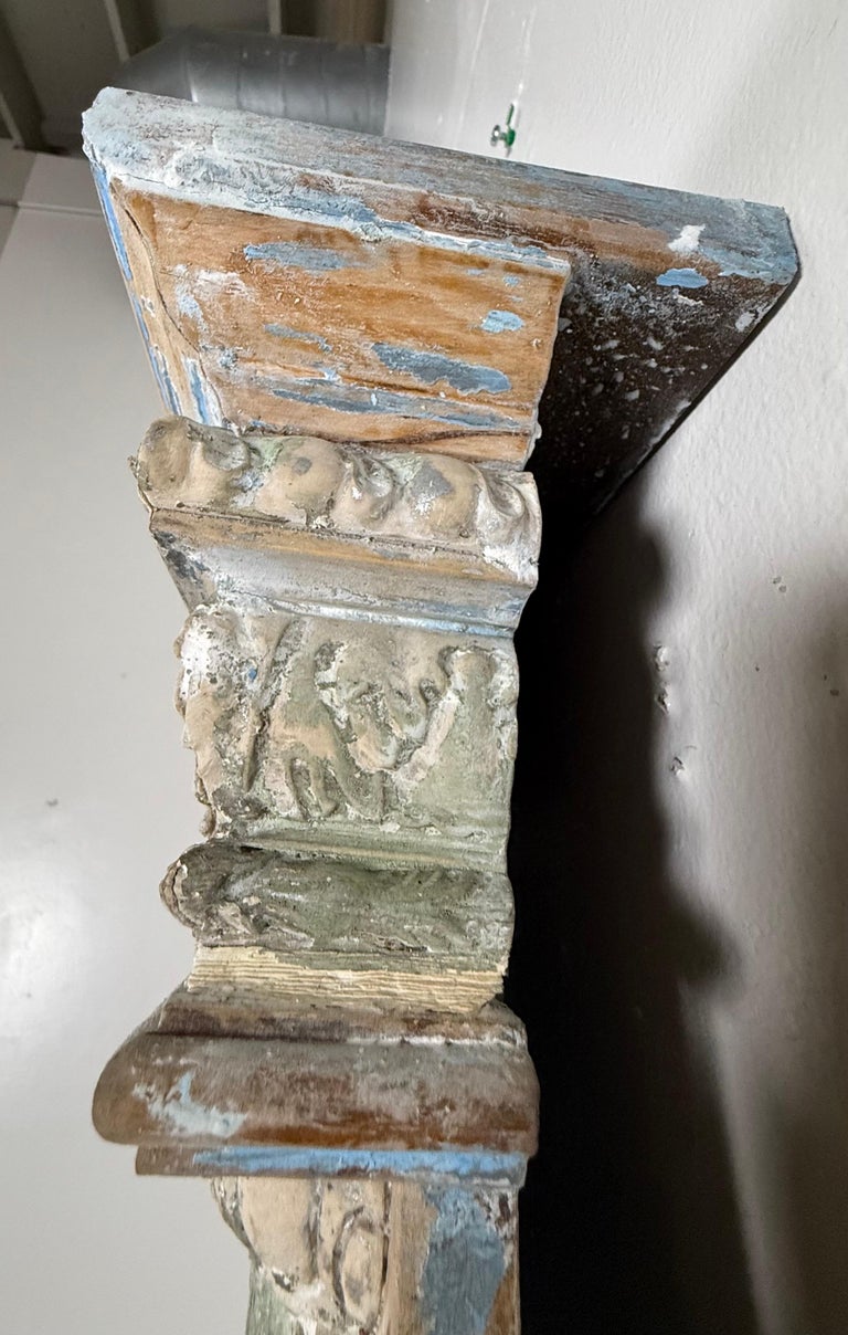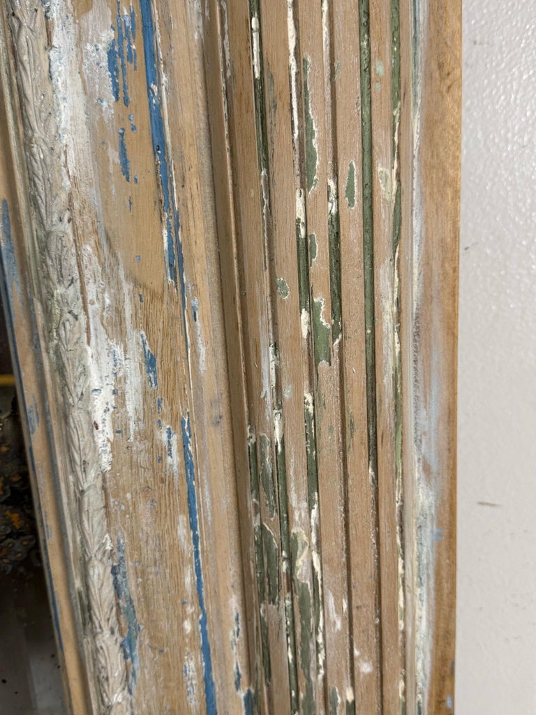A magnificent French trumeau mirror in the Neoclassical style, featuring an elaborately carved frame with fluted pilasters, acanthus detailing, and a bold cornice top. The surface retains its original multi-layered painted finish, beautifully timeworn with traces of pale blue, sage green, and ivory over exposed natural wood. The combination of colors and the layered distressing give the piece a soft, romantic patina evocative of centuries of use and refinement.