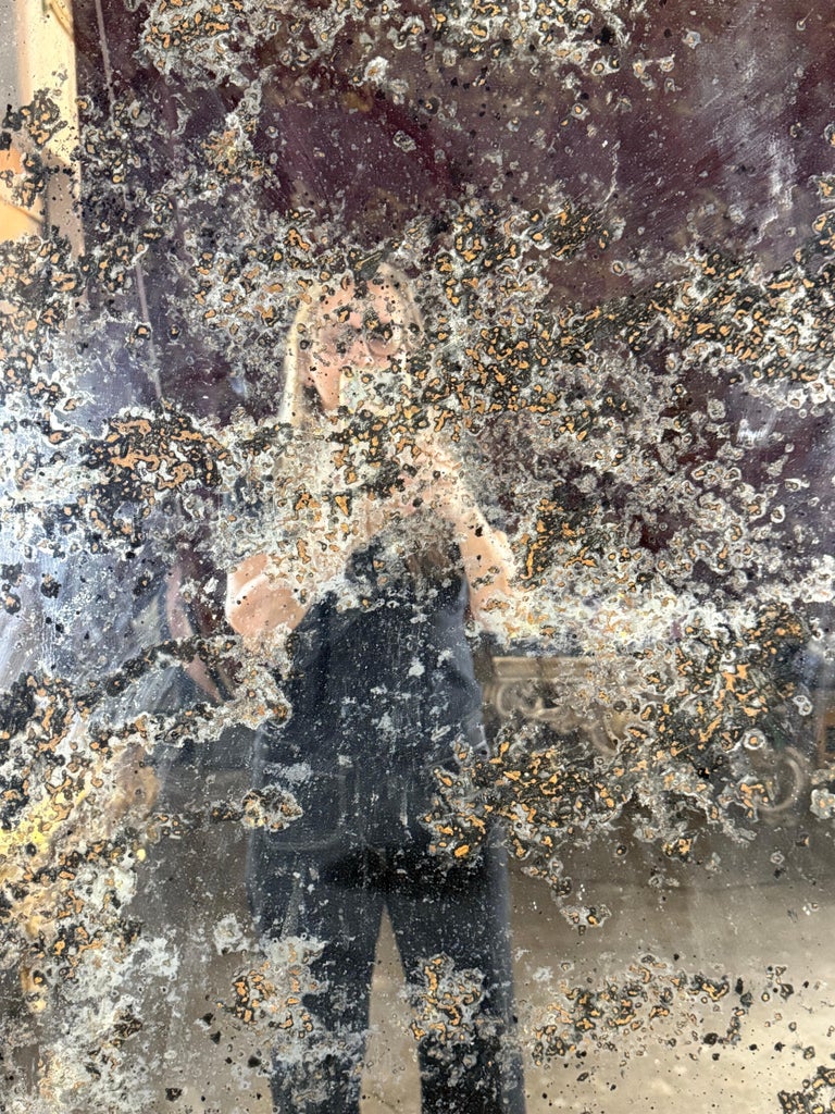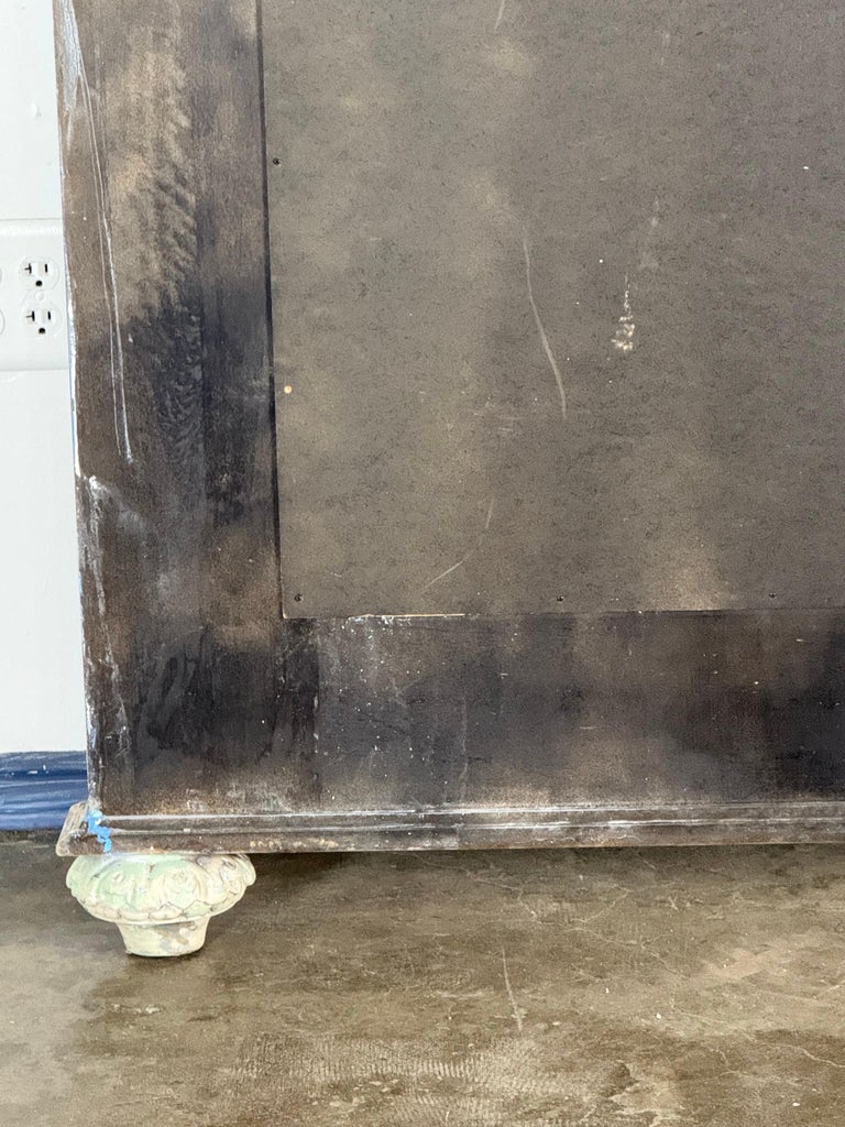 The antique mirror plate is aged to a dramatic mottled and smoky surface, adding depth, texture, and intrigue. This striking oxidation—ranging from silvery undertones to darkened cloud-like patches—creates an almost painterly quality that enhances the mirror’s sculptural presence.