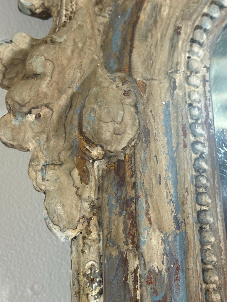 The frames retain their original gesso and parcel-gilt finish, now beautifully time-softened. Remnants of water gilding, exposed bole, and subtle polychrome undertones are visible throughout, creating a nuanced silvery-gold surface with exceptional depth and patina.