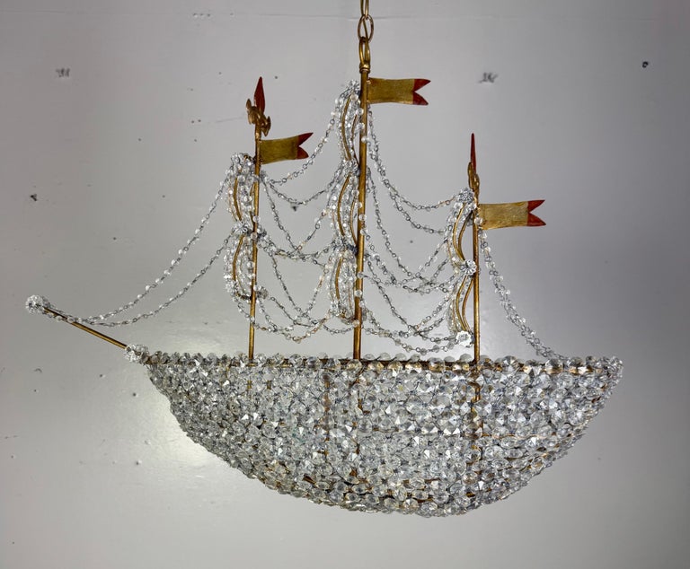 This exquisite ship-form chandelier is a custom creation by Miamar Home, an atelier based in Los Angeles renowned for its collaboration with the city’s finest local artisans. Entirely handmade, the chandelier is meticulously crafted with hundreds of individually hand-strung crystal beads that drape elegantly along the masts and rigging, creating a luminous, sculptural silhouette. The ship’s frame is fashioned from gilded metal with delicate flag finials, lending a whimsical yet sophisticated presence. Light refracts beautifully through the faceted crystals, evoking the glimmer of sunlight on water. Each detail reflects the craftsmanship and artistry of Los Angeles’ most skilled metalworkers and bead artisans. Perfect as a statement piece over a dining table, in an entryway, or as an unexpected focal point in a living space, this chandelier combines romantic nautical inspiration with the refinement of bespoke design.