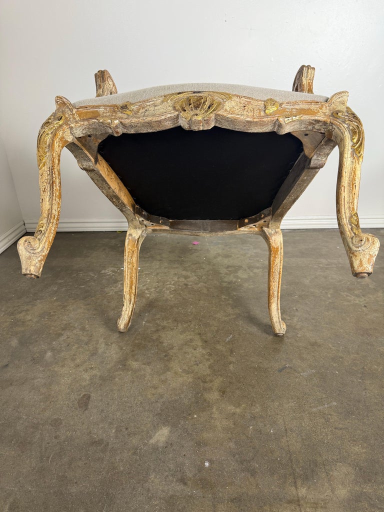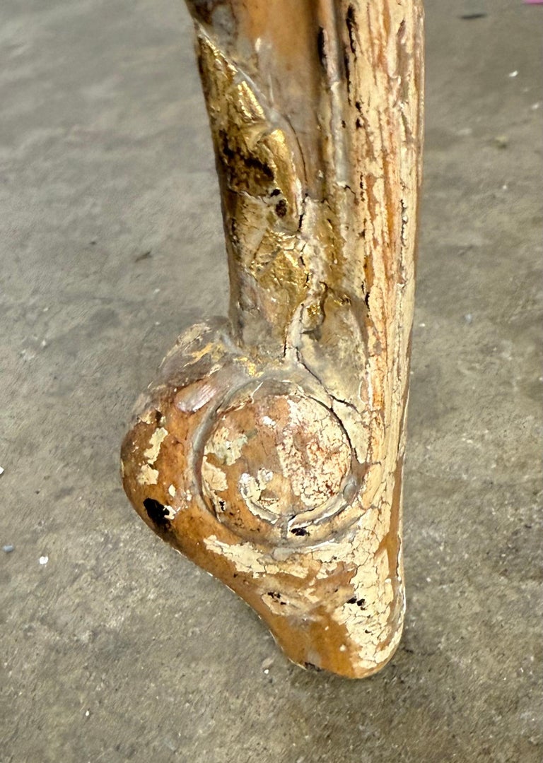The wood surfaces exhibit a desirable distressed, layered finish—a mix of exposed carving, remnants of old paint and gilding, and natural wear consistent with age—creating the ideal antique look that designers love. The chairs rest on classic cabriole legs ending in scroll feet, each beautifully carved and unique.